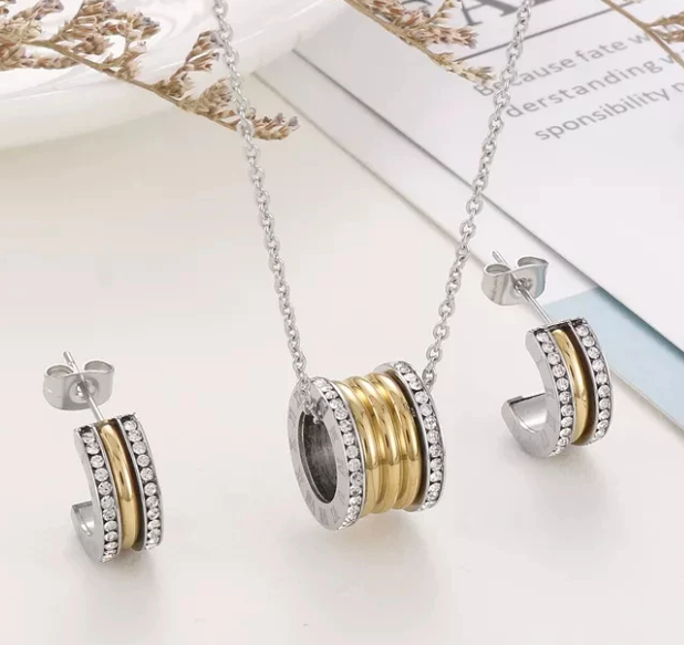 Esse conjunto é composto por um colar e brincos com pingentes em formato cilíndrico, realçados por fileiras de cristais brilhantes e detalhes metálicos em alto relevo. Disponível em versões dourada, prateada e bicolor, ele se adapta perfeitamente a todos os estilos – do clássico ao contemporâneo.
